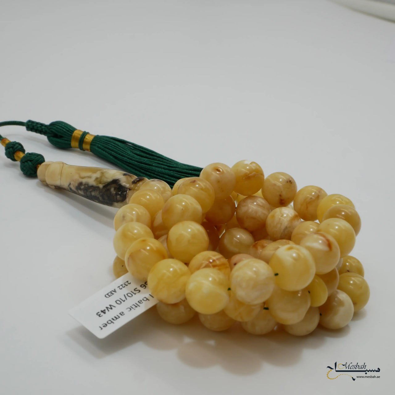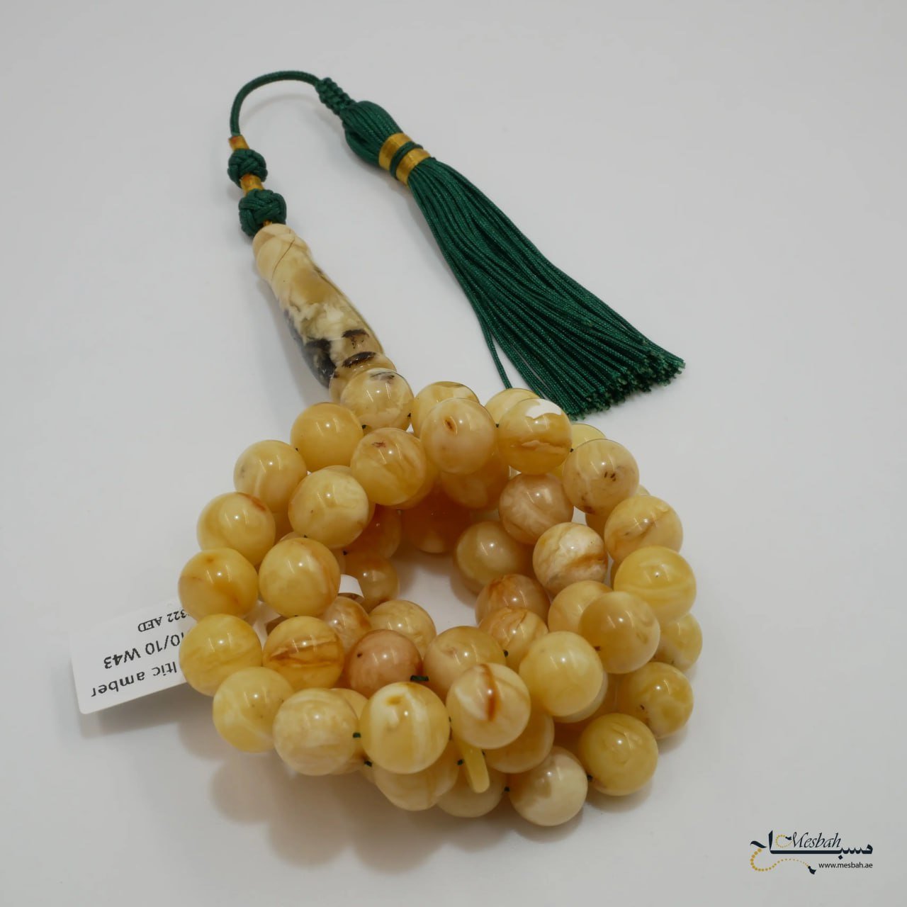 يأتي المسباح بتدرجات لونية جذابة، تتراوح بين دفء العسلي وبريق الذهبي المشرق، مع لمعة طبيعية آسرة تعكس جمال الكهرمان الكالينغرادي وتميزه عن باقي الأنواع. كل خرزة تحمل في داخلها لمسة من سحر الطبيعة، مما يضيف قيمة فنية وروحية لا تقدر بثمن.