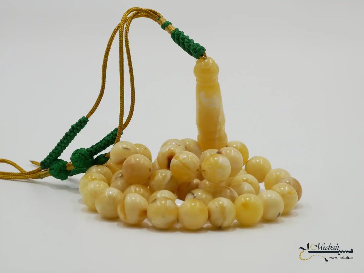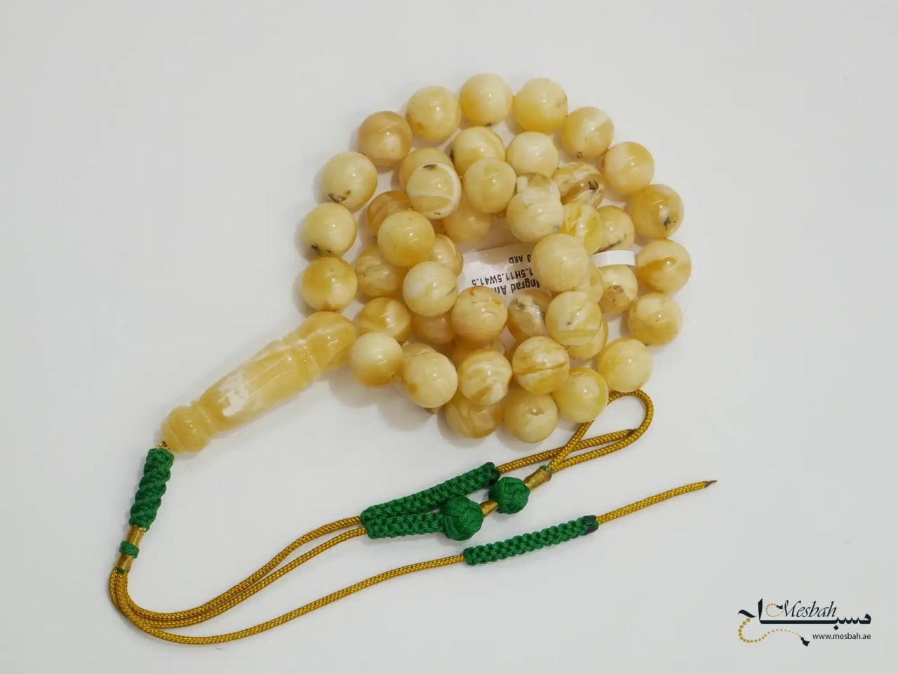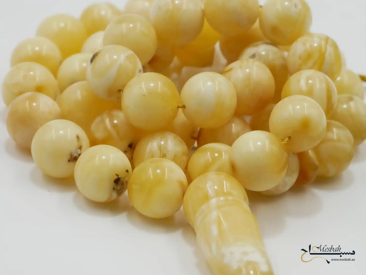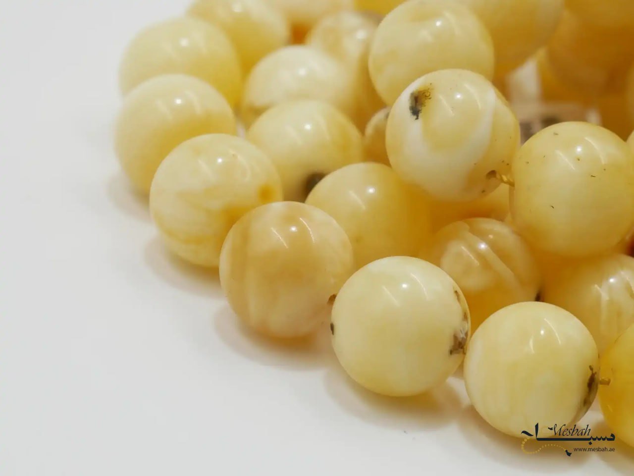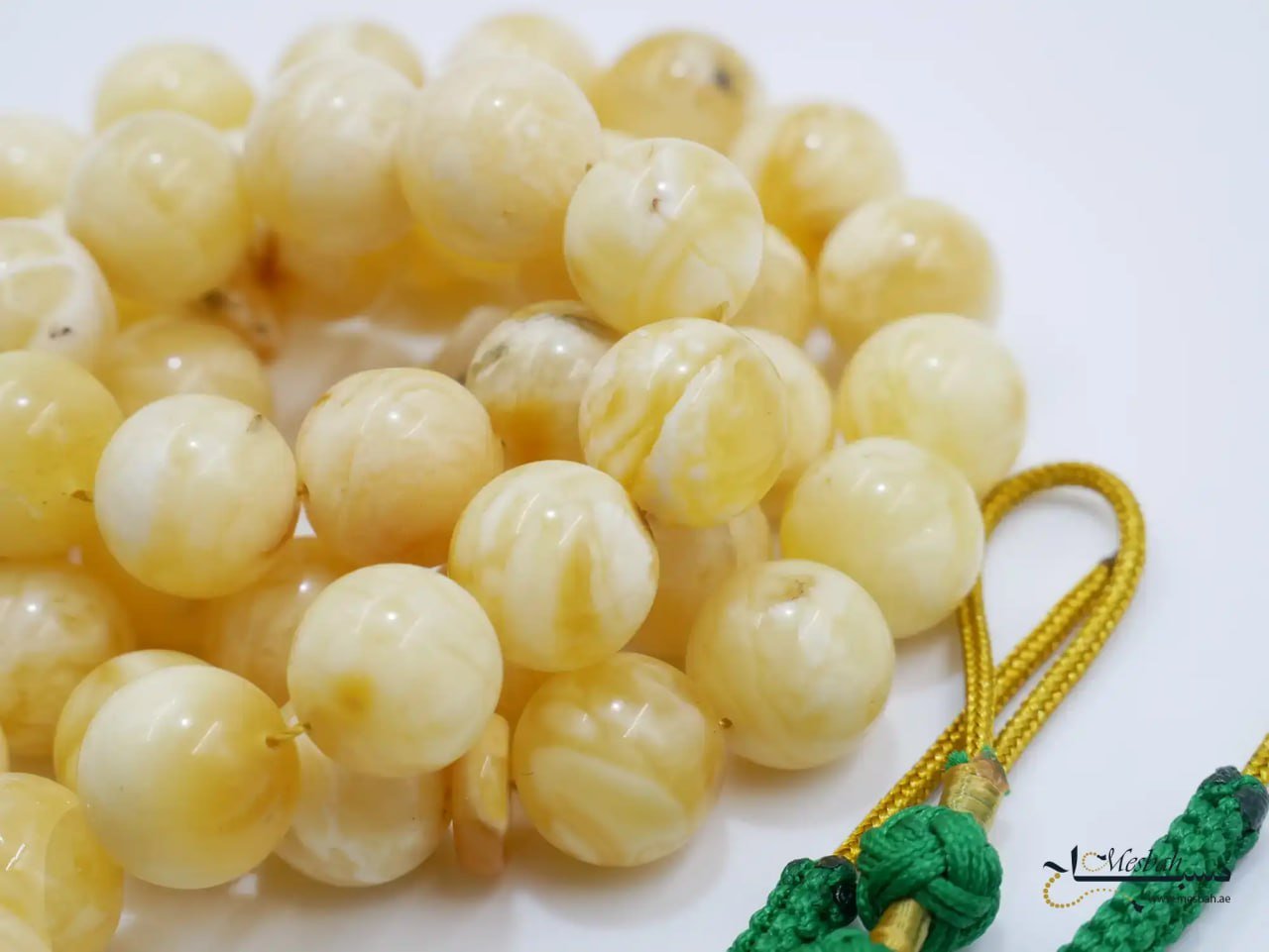 ارتقِ بذوقك مع قطعة تجمع بين الأصالة والجمال الطبيعي – مسباح فاخر مصنوع من كهرمان كالنغرادي الطبيعي، بلون عسلي ملطخ بلمسات جبسية ناعمة، ونمش خفيف يُضفي طابعًا فريدًا على كل حبة.