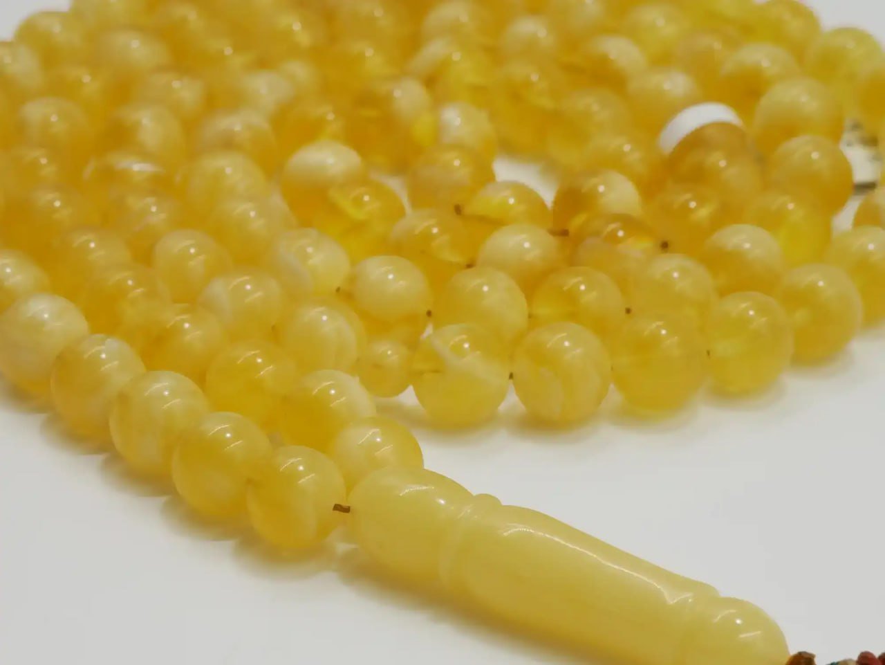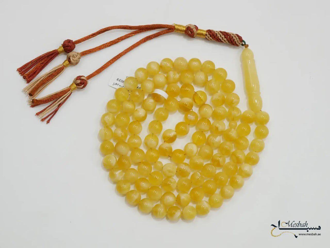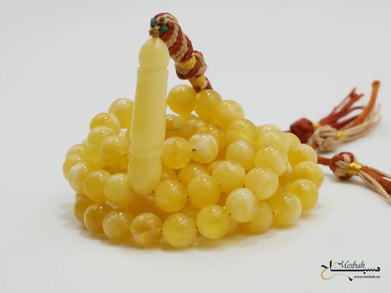 مسباح فاخر مصنوع من الكهرمان الطبيعي بخامة سوبر عالية الجودة، يتميز بقصته الدائرية المتناسقة التي تمنح راحة في الاستخدام وأناقة في المظهر.