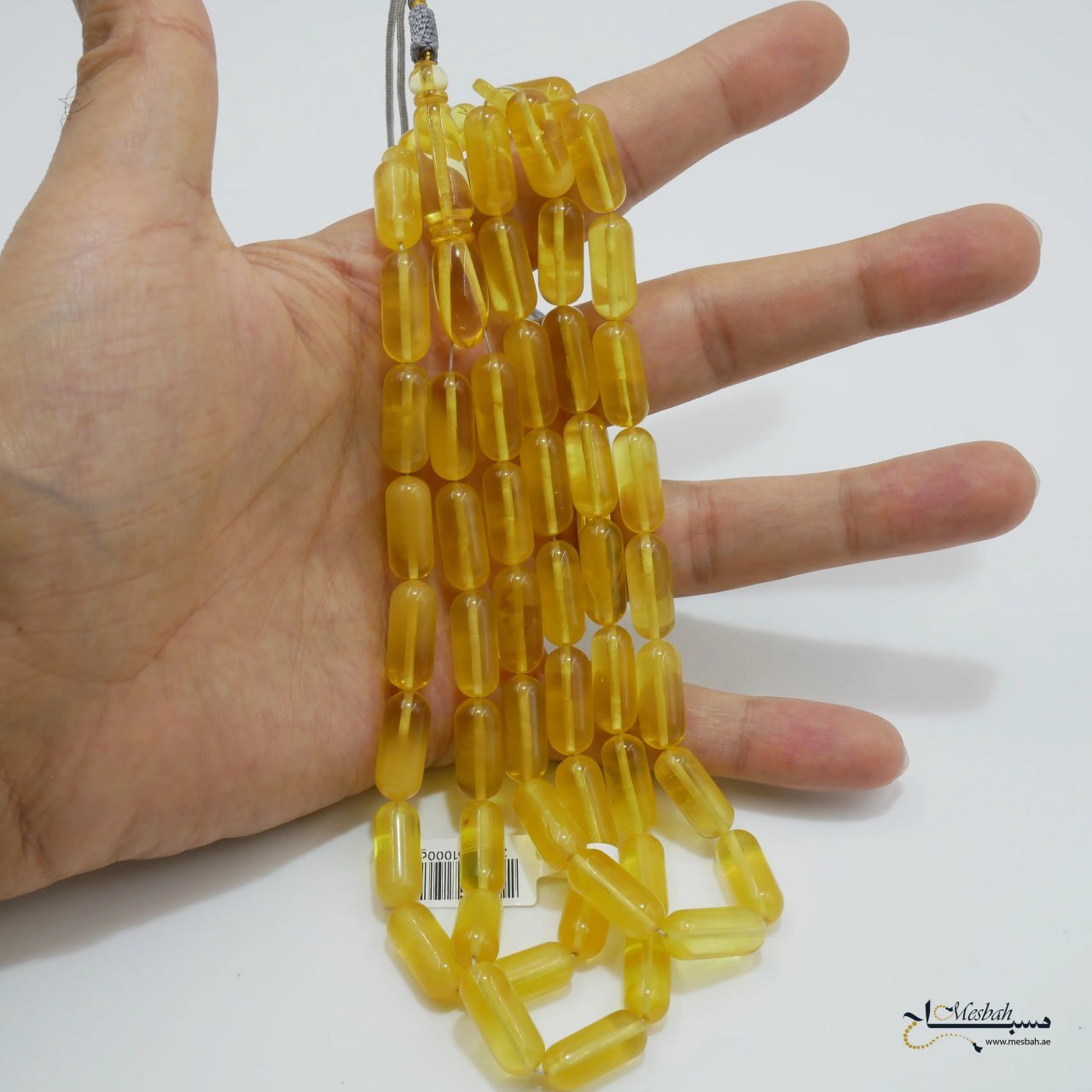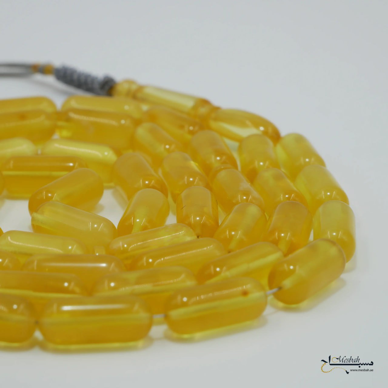 مسباح كهرمان كالينغرادي فاخر بتصميم قصة كبسولية متناسقة تعكس فخامة الكهرمان الطبيعي وأصالته. يتميز بكونه مغيم اللون، حيث تتداخل درجات الكهرمان في طبقات ضبابية ناعمة تمنحه مظهراً فريداً يجمع بين الغموض والجاذبية. هذا التدرج المميز يضيف عمقاً بصرياً للمسباح ويجعله قطعة فنية متكاملة.