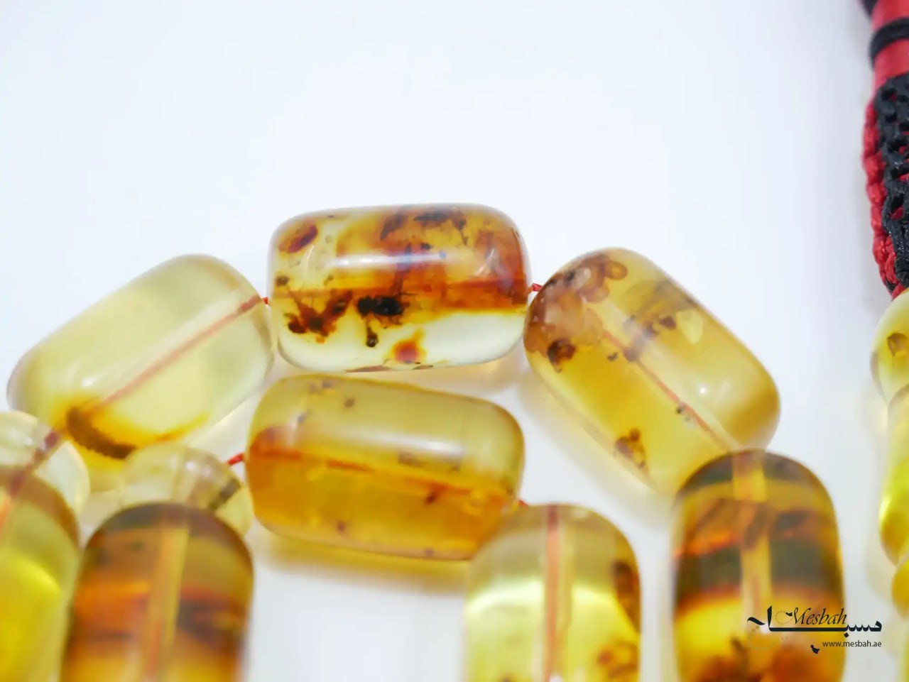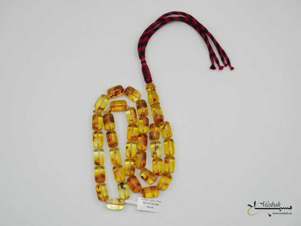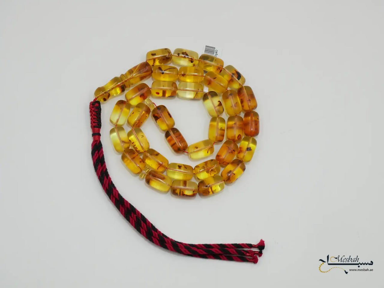 الحبات مقطوعة بشكل مستطيل مائل مع لمسة انسيابية تبرز فخامة الكهرمان وتضفي على المسبحة مظهراً أنيقاً وراقياً. الملمس ناعم جداً، ما يمنح صاحبها راحة فائقة أثناء التسبيح أو التحريك بين الأصابع.