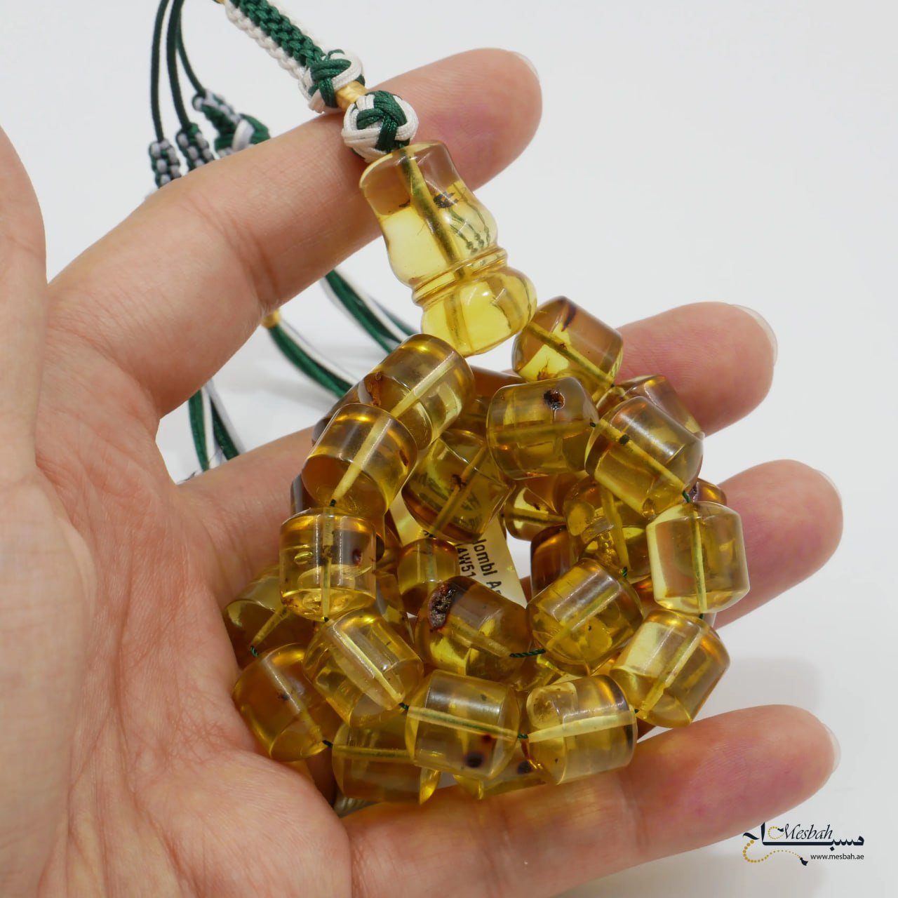 اكتشف الفخامة الحقيقية مع هذه المسبحة الفريدة المصنوعة من الكهرمان الكولومبي الحشري الأصيل، المعروف بلونه الأصفر العسلي الذهبي وشفافيته النادرة. تمتاز هذه القطعة بقصتها الصندوقية المميزة، التي تمنحها شكلاً عصرياً وجذاباً يختلف عن التصميمات التقليدية.