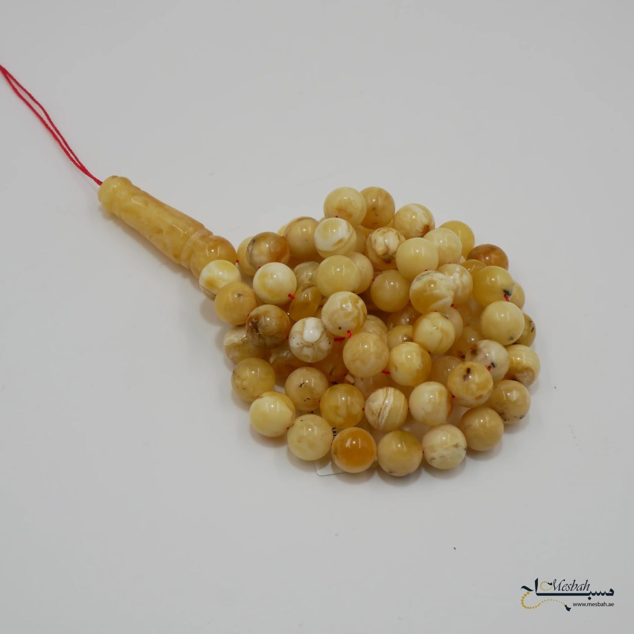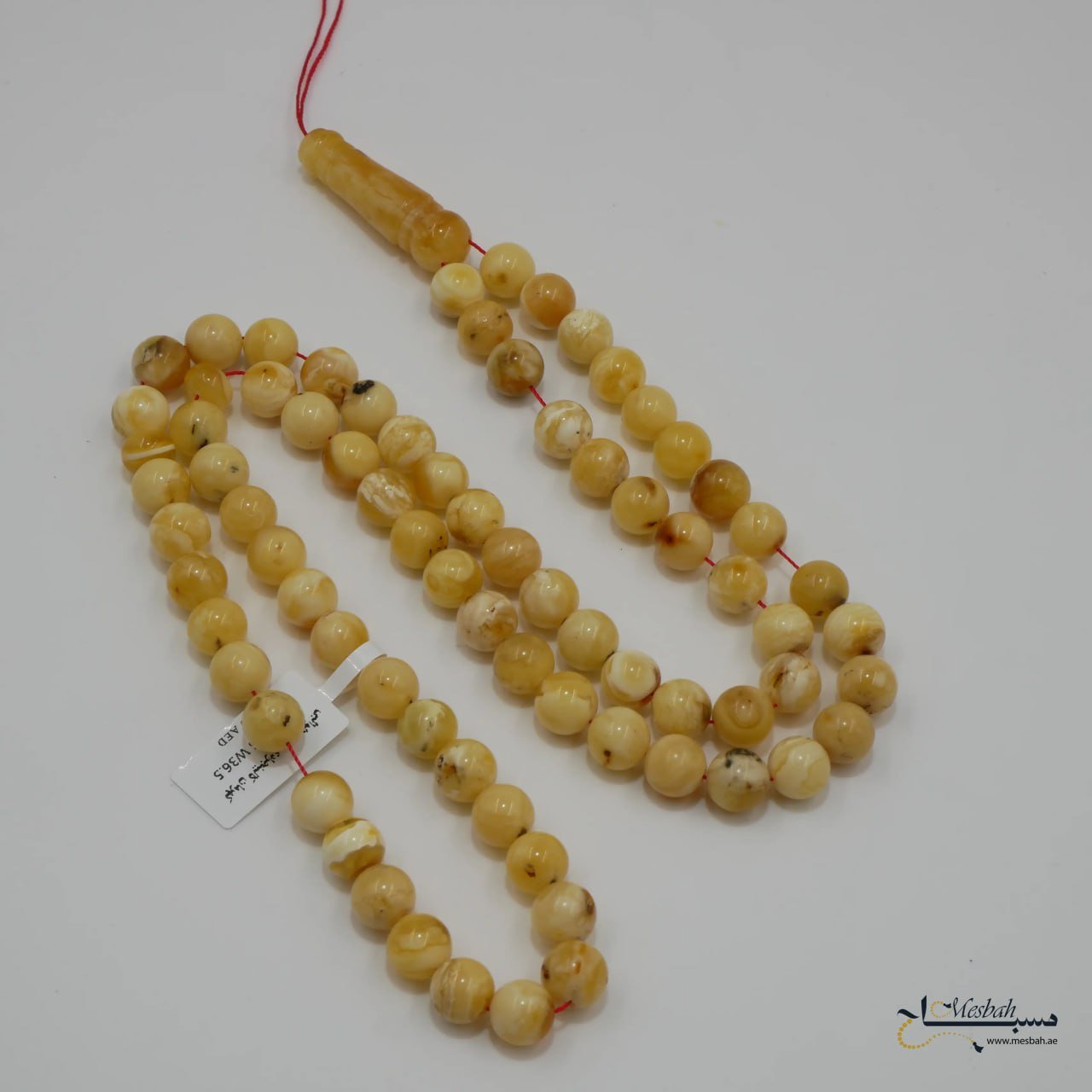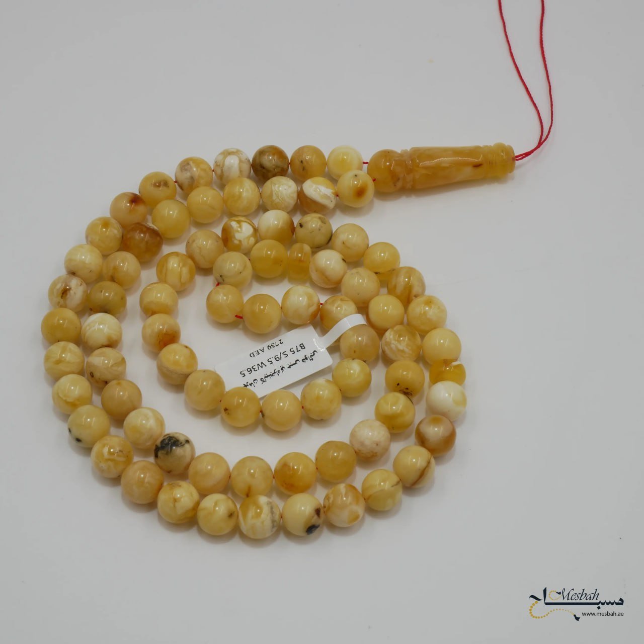خامة نادرة: حباتها من الكهرمان الطبيعي الذي يُعرف بجودته العالية ولونه العسلي الفاتح الذي يميل إلى الأبيض، مع شوائب طبيعية تضفي عليها طابعًا فريدًا وأصالة.