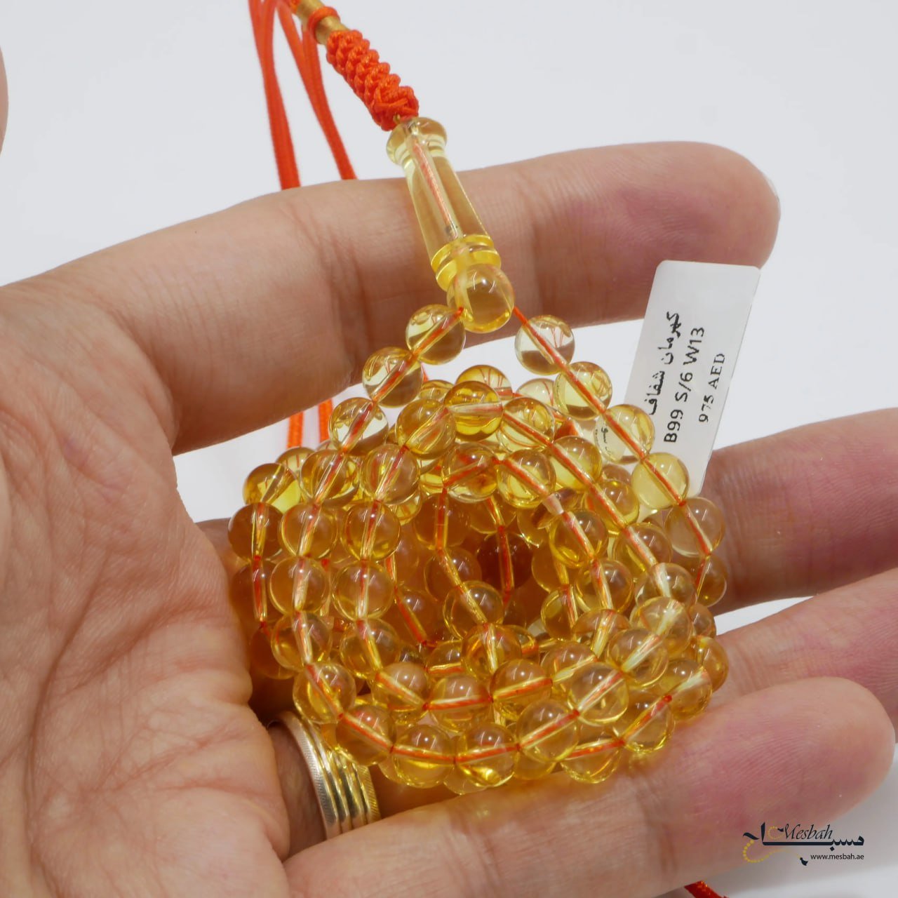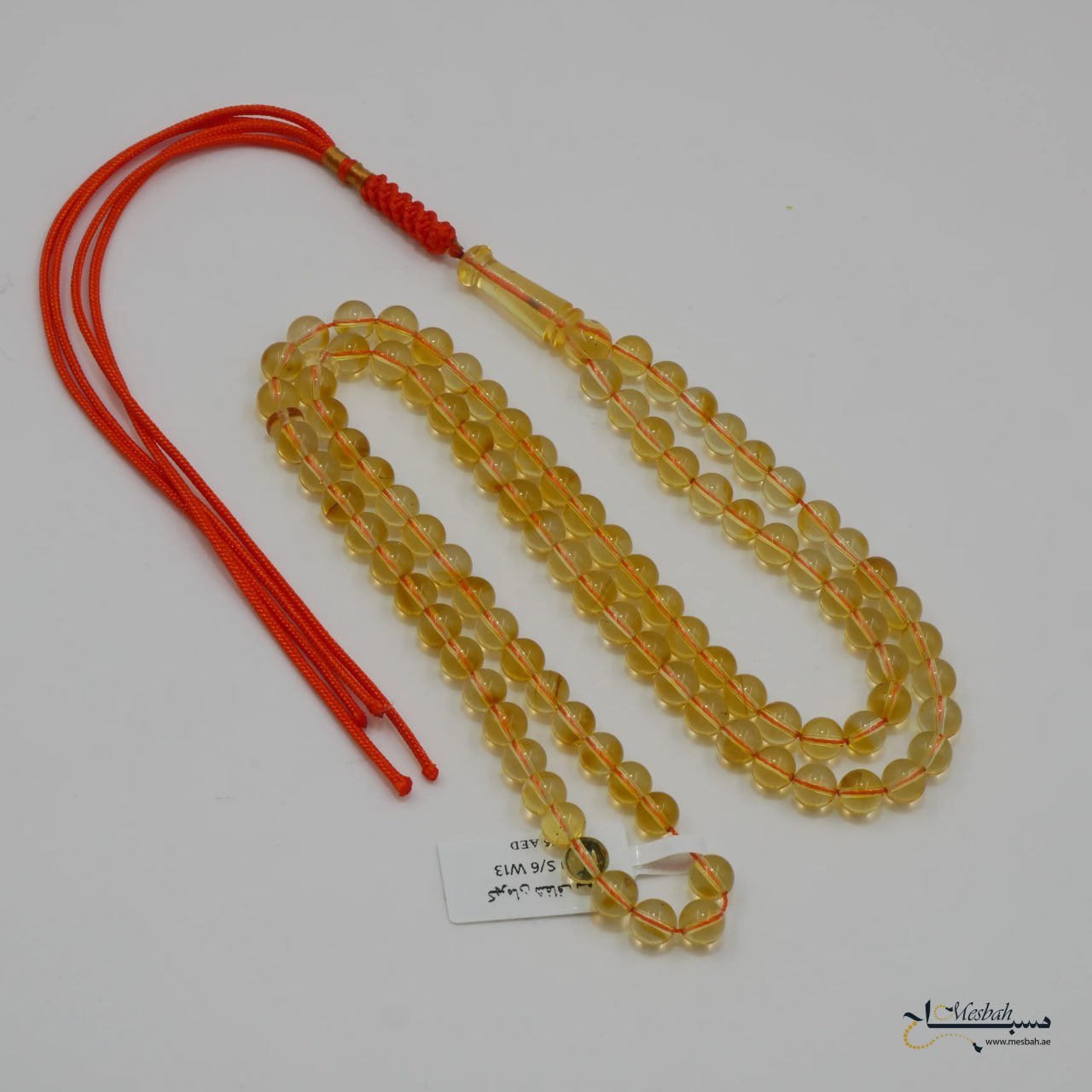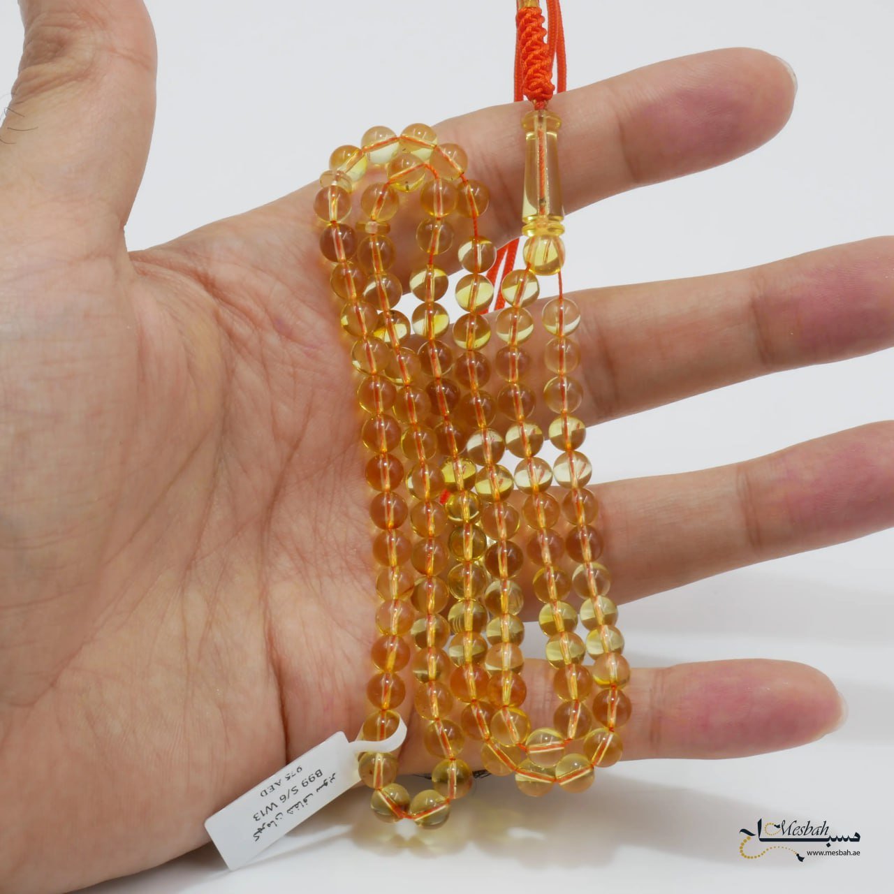 This clear Baltic amber rosary features round beads that reflect a warm honey hue. The beads are consistent in size and color and feature "super perforation," meaning the holes are very fine and allow the thread to pass smoothly.